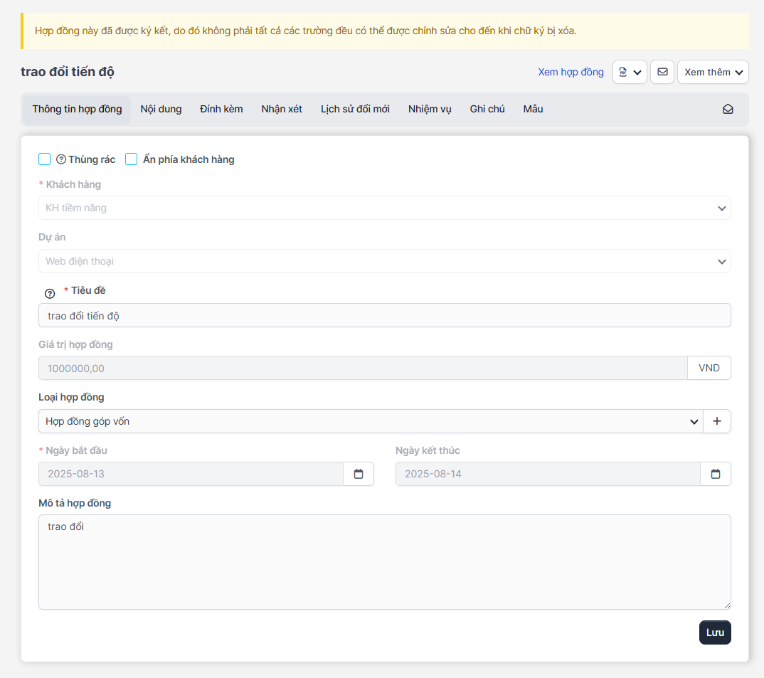 - Thông tin khách hàng/đối tác được liên kết trực tiếp với hợp đồng.