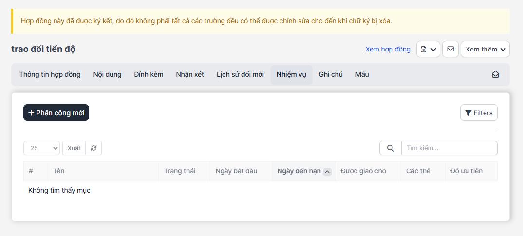 - Nhiệm vụ liên quan đến hợp đồng được giao hoặc hoàn thành.