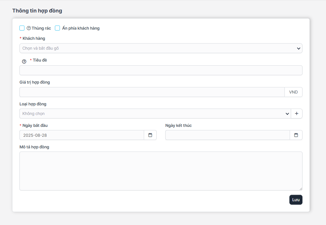 - Hỗ trợ upload hợp đồng scan, phụ lục, báo giá, hóa đơn.